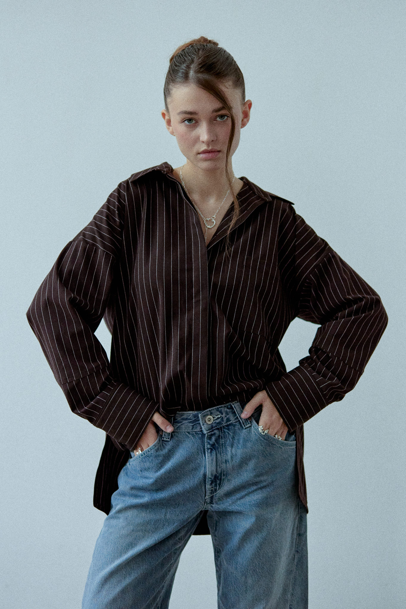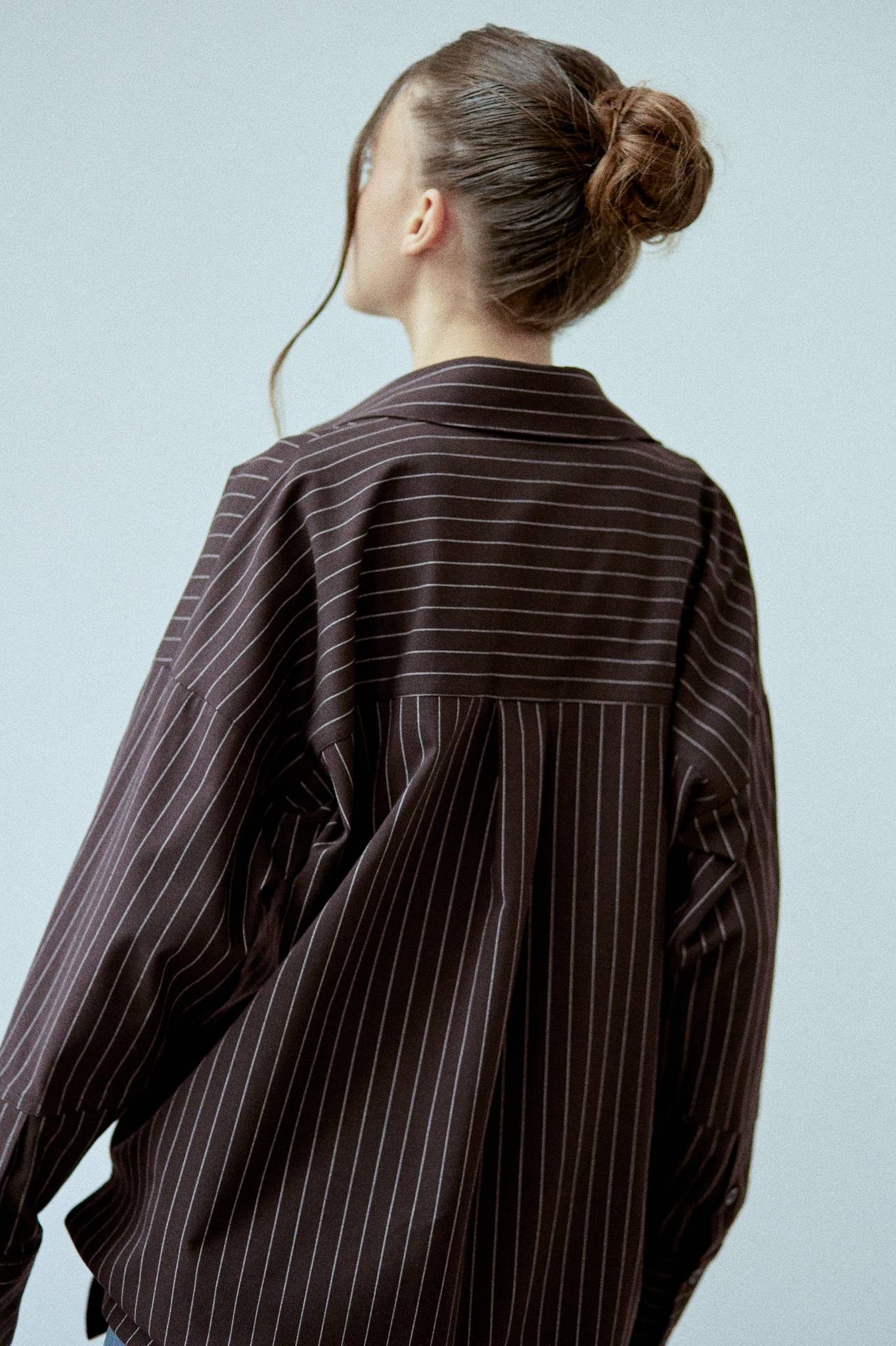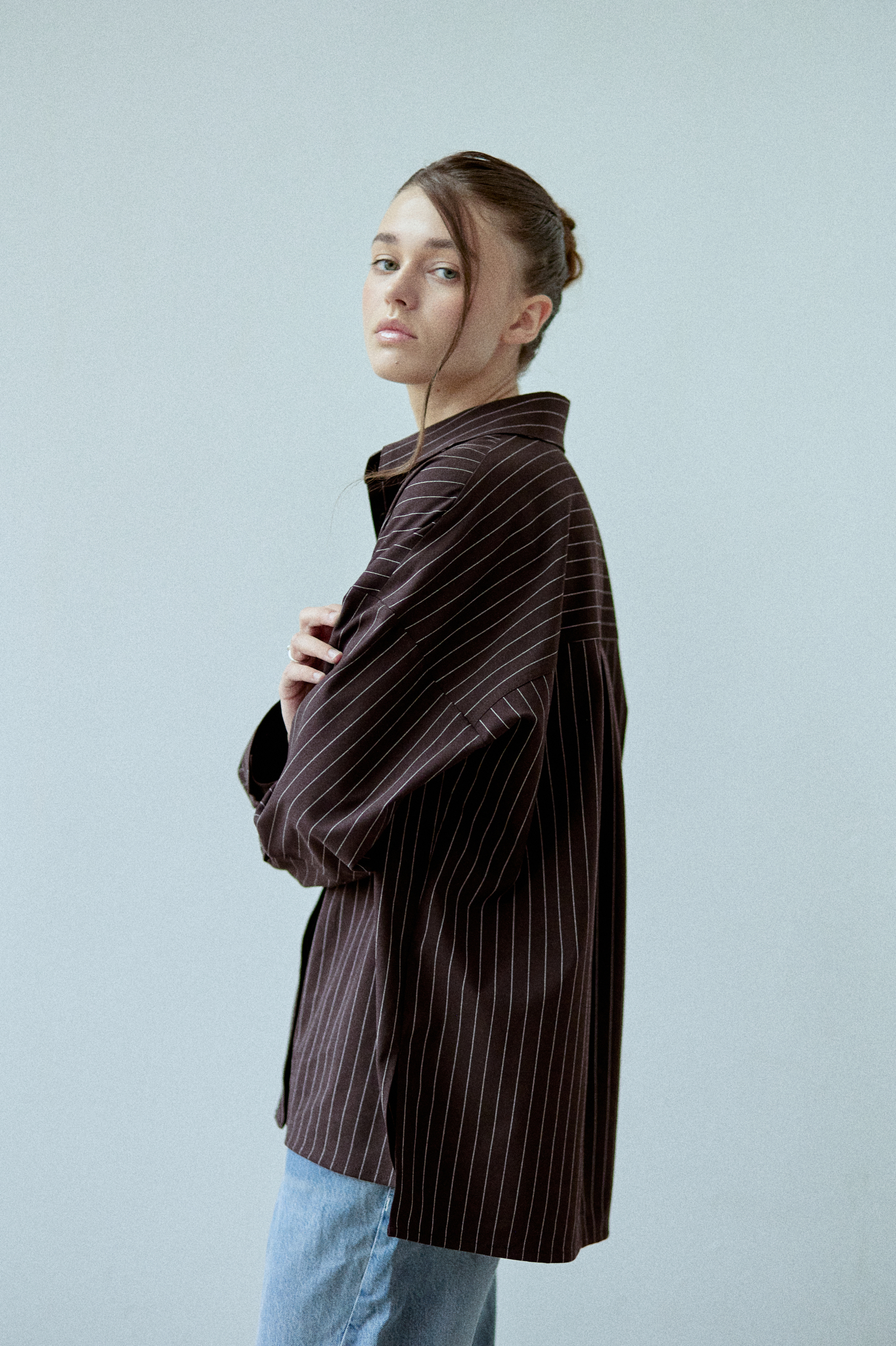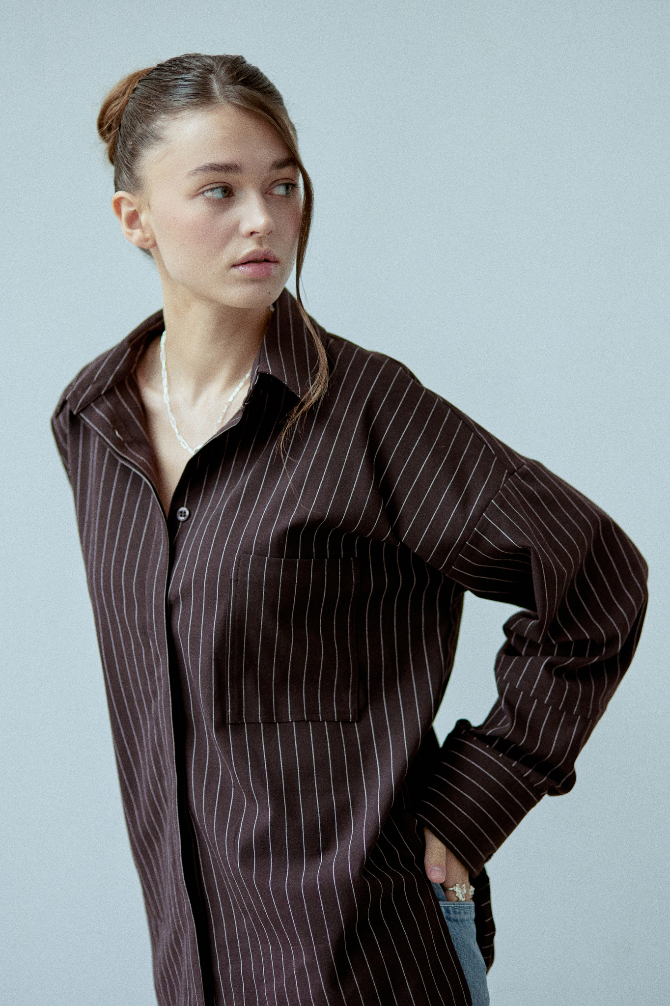 Klasyczna koszula o luźnym, oversize’owym kroju z długim rękawem zakończonym mankietem. Wykonana z tkaniny w subtelny prążek w nieoczywistym mahoniowym odcieniu. Ma lekko opuszczoną linię ramion i zapięcie na krytą listwę guzikową, co nadaje jej nowoczesnej elegancji i ponadczasowego charakteru.
