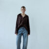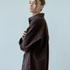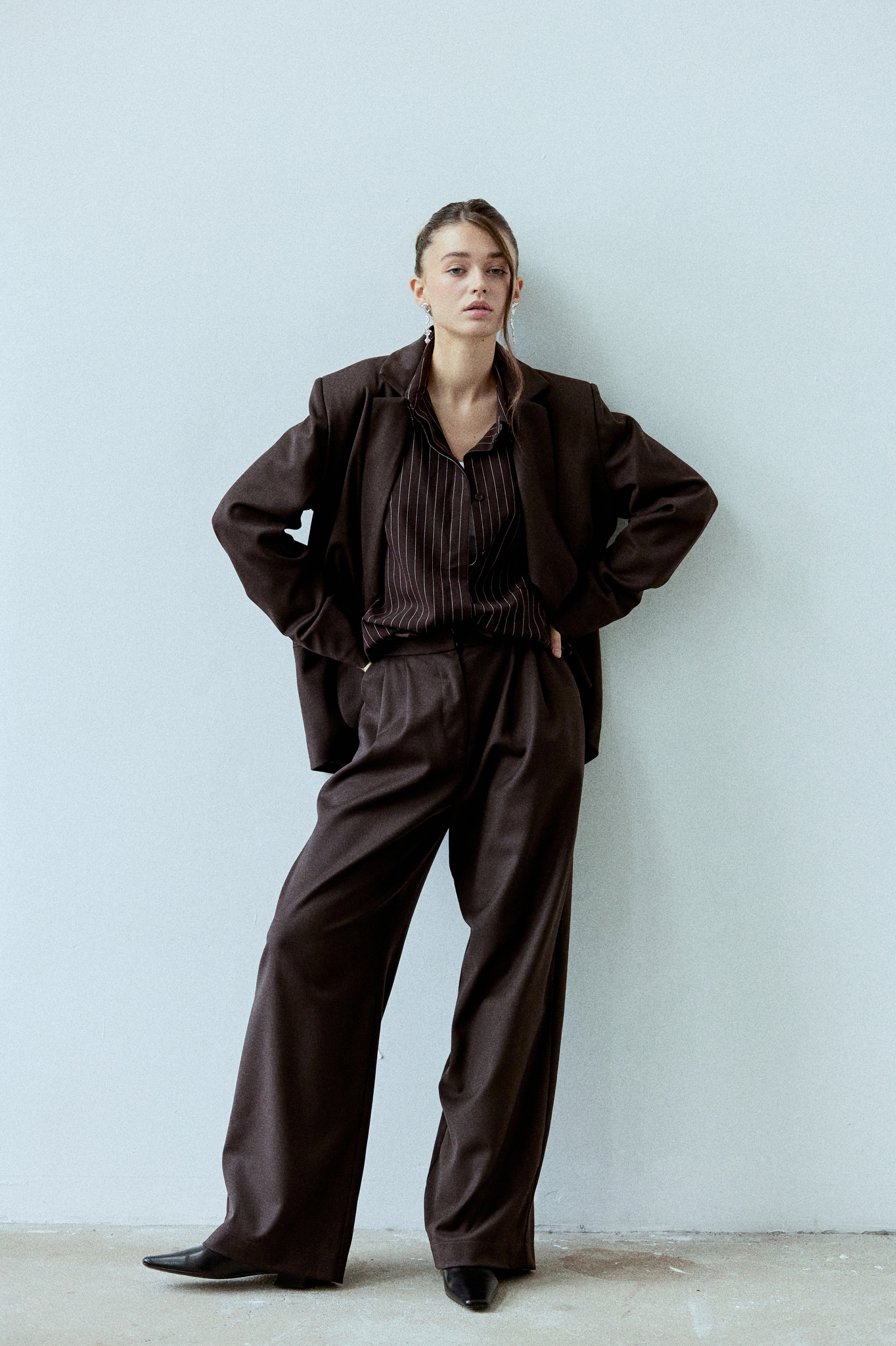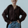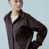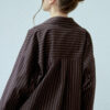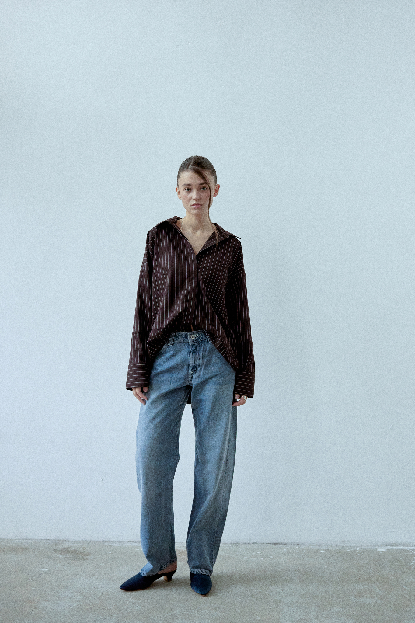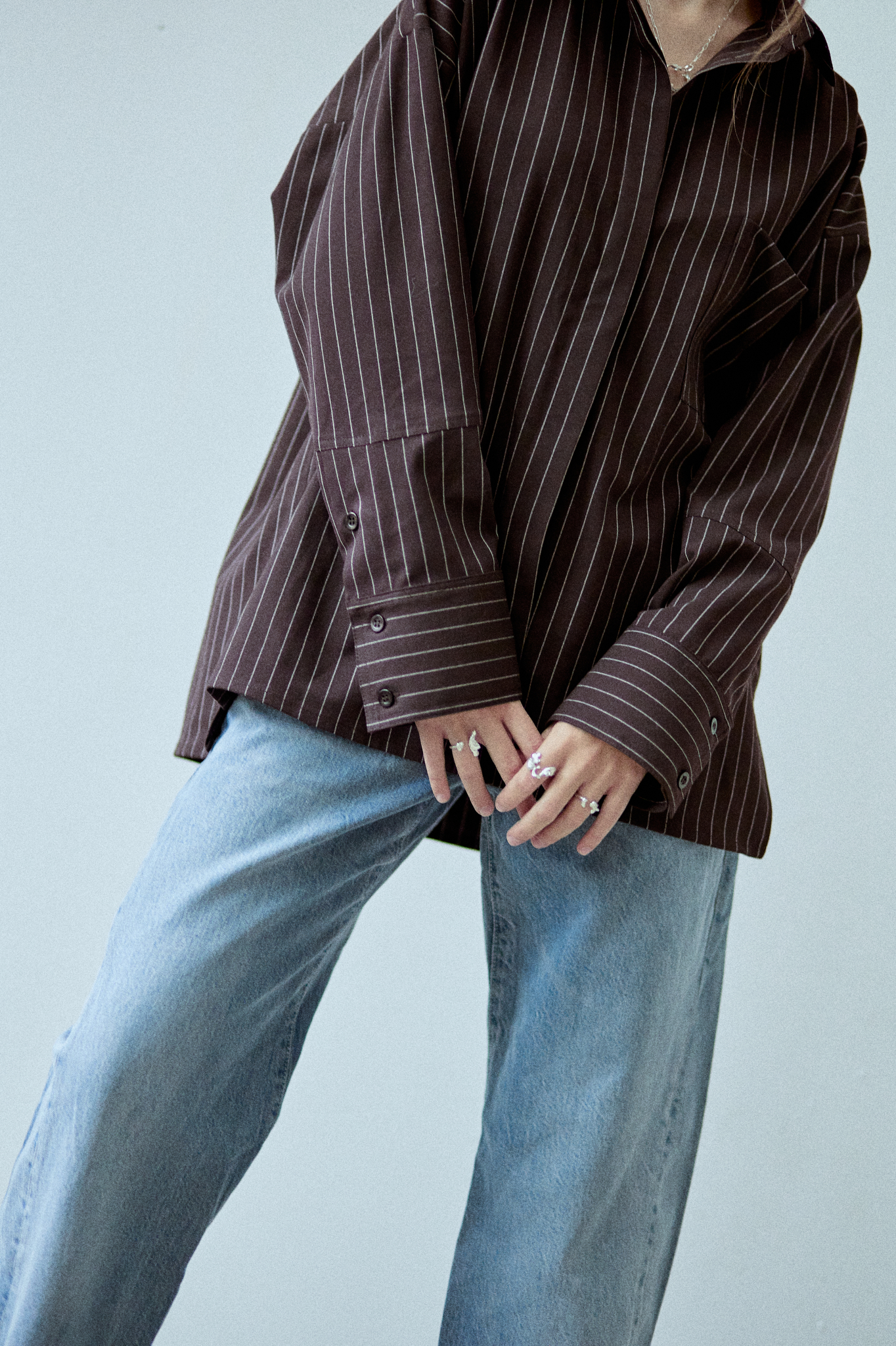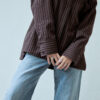 Klasyczna koszula o luźnym, oversize’owym kroju z długim rękawem zakończonym mankietem. Wykonana z tkaniny w subtelny prążek w nieoczywistym mahoniowym odcieniu. Ma lekko opuszczoną linię ramion i zapięcie na krytą listwę guzikową, co nadaje jej nowoczesnej elegancji i ponadczasowego charakteru.