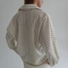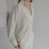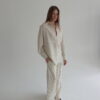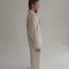 Elegancki, minimalistyczny komplet wykonany z wyjątkowo lekkiej, cienkiej wełny o subtelnie półtransparentnej strukturze. Naturalna tkanina zapewnia przewiewność, miękko układa się na sylwetce.
