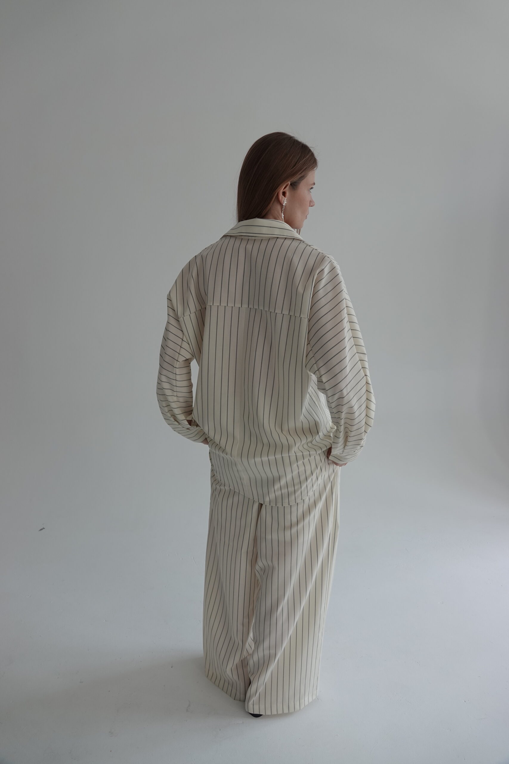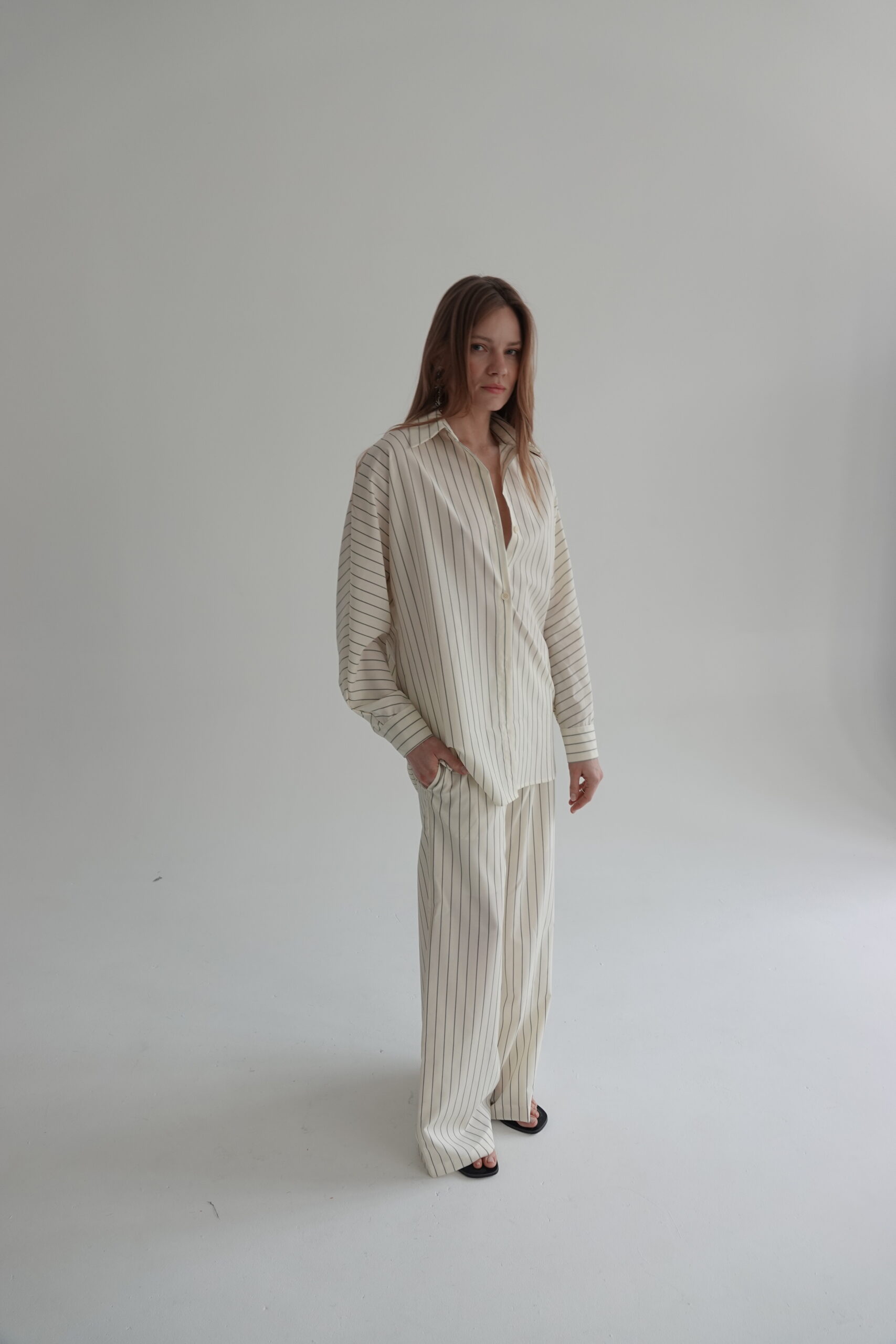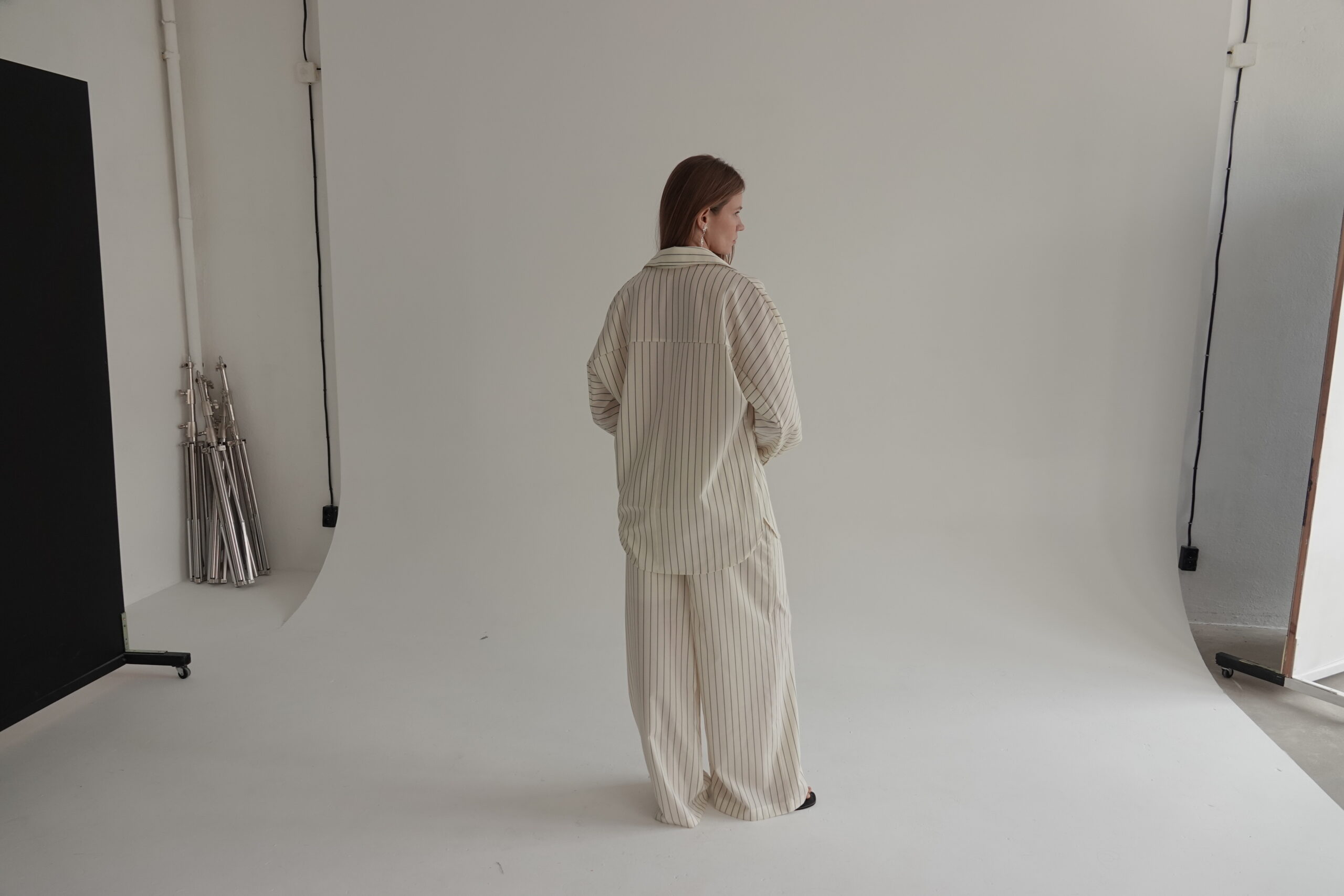 Koszula o swobodnym kroju z klasycznym kołnierzem i zapięciem na guziki doskonale równoważy proste, luźno opadające spodnie z prostą nogawką. Zestaw można nosić zarówno jako komplet, jak i osobno.