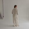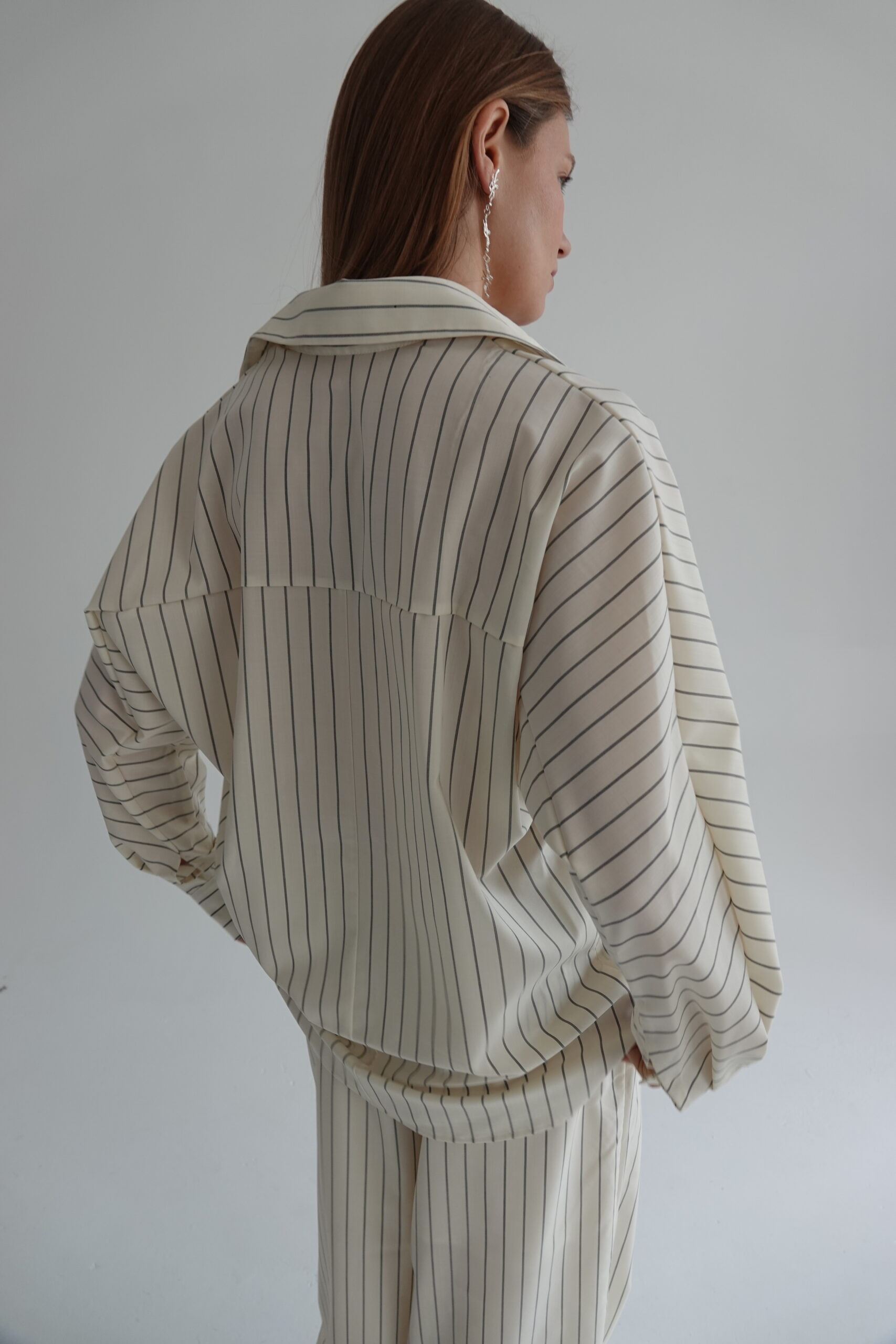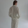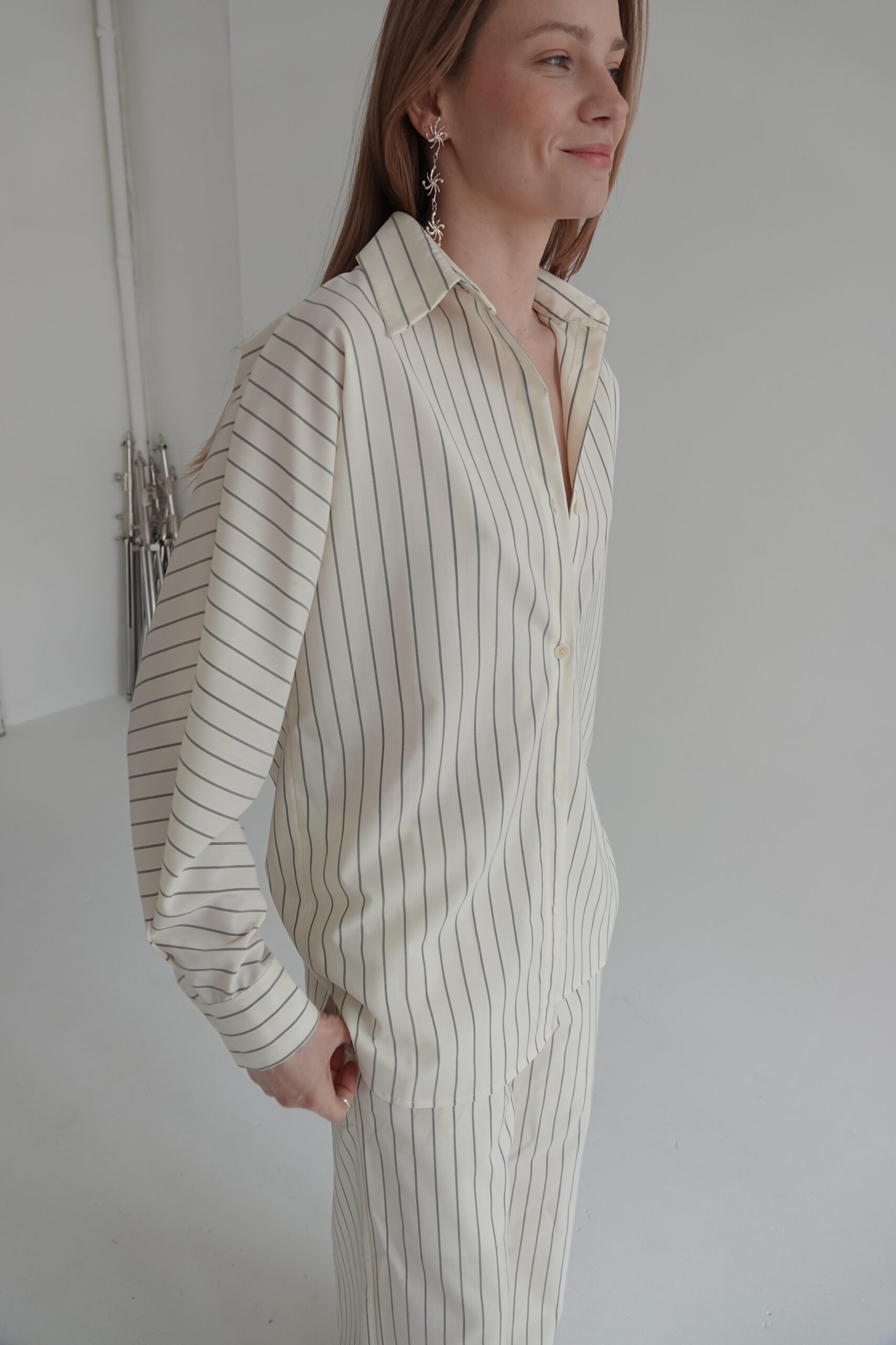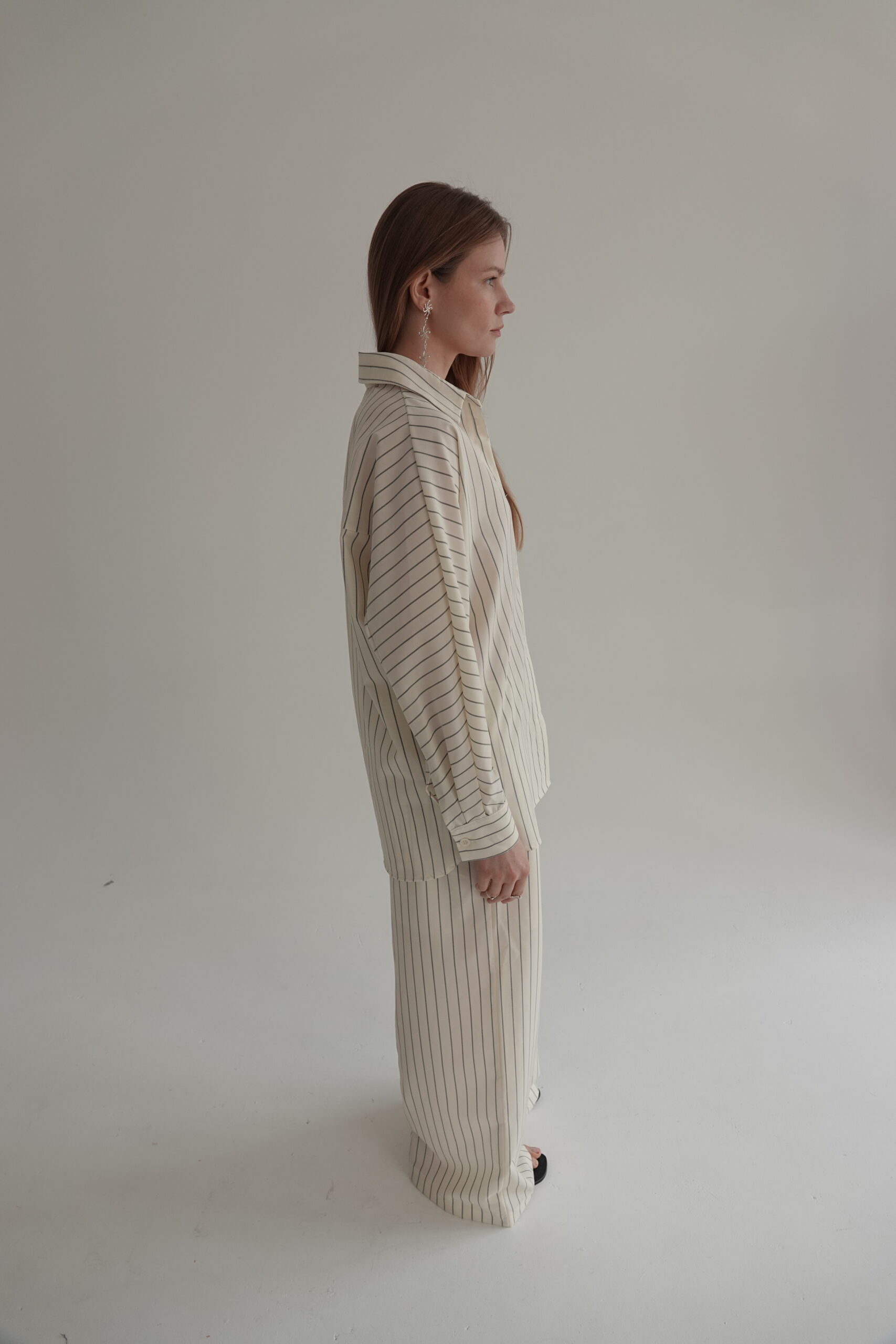 Koszula o swobodnym kroju z klasycznym kołnierzem i zapięciem na guziki doskonale równoważy proste, luźno opadające spodnie z prostą nogawką. Zestaw można nosić zarówno jako komplet, jak i osobno.