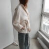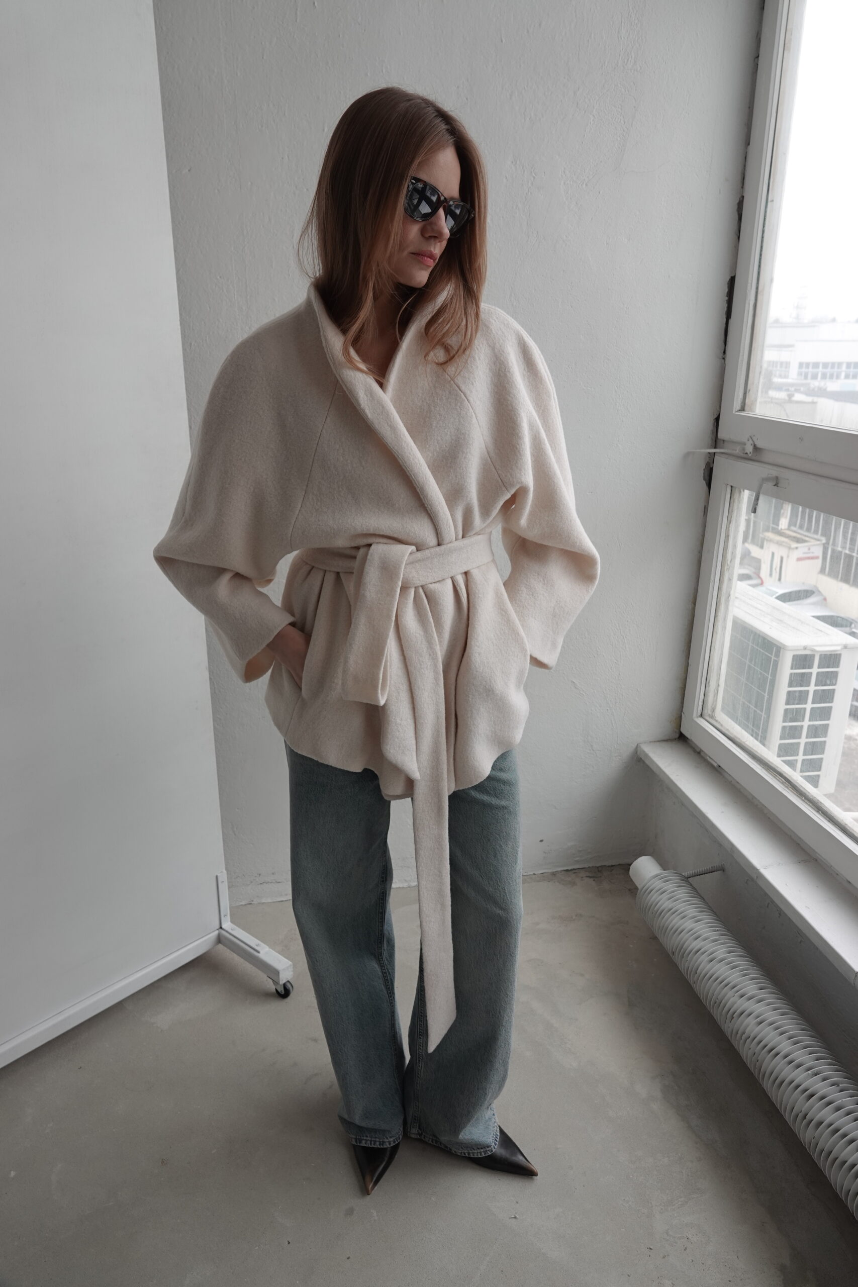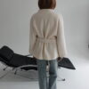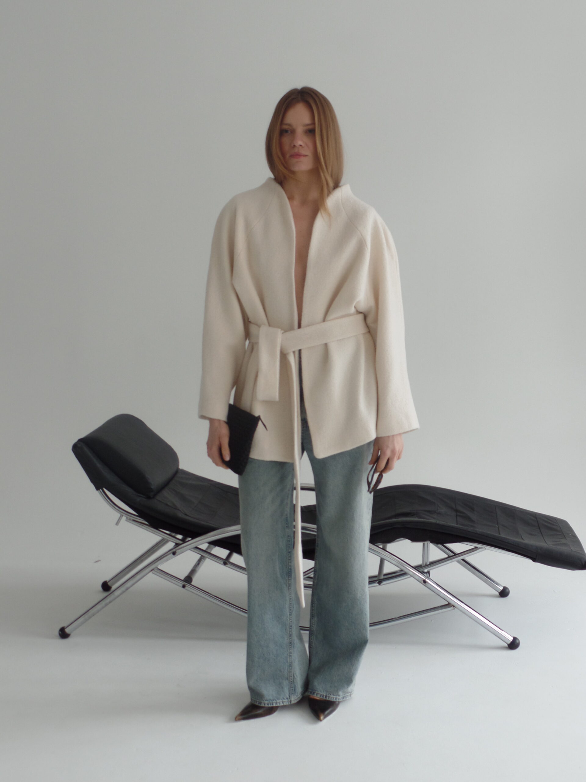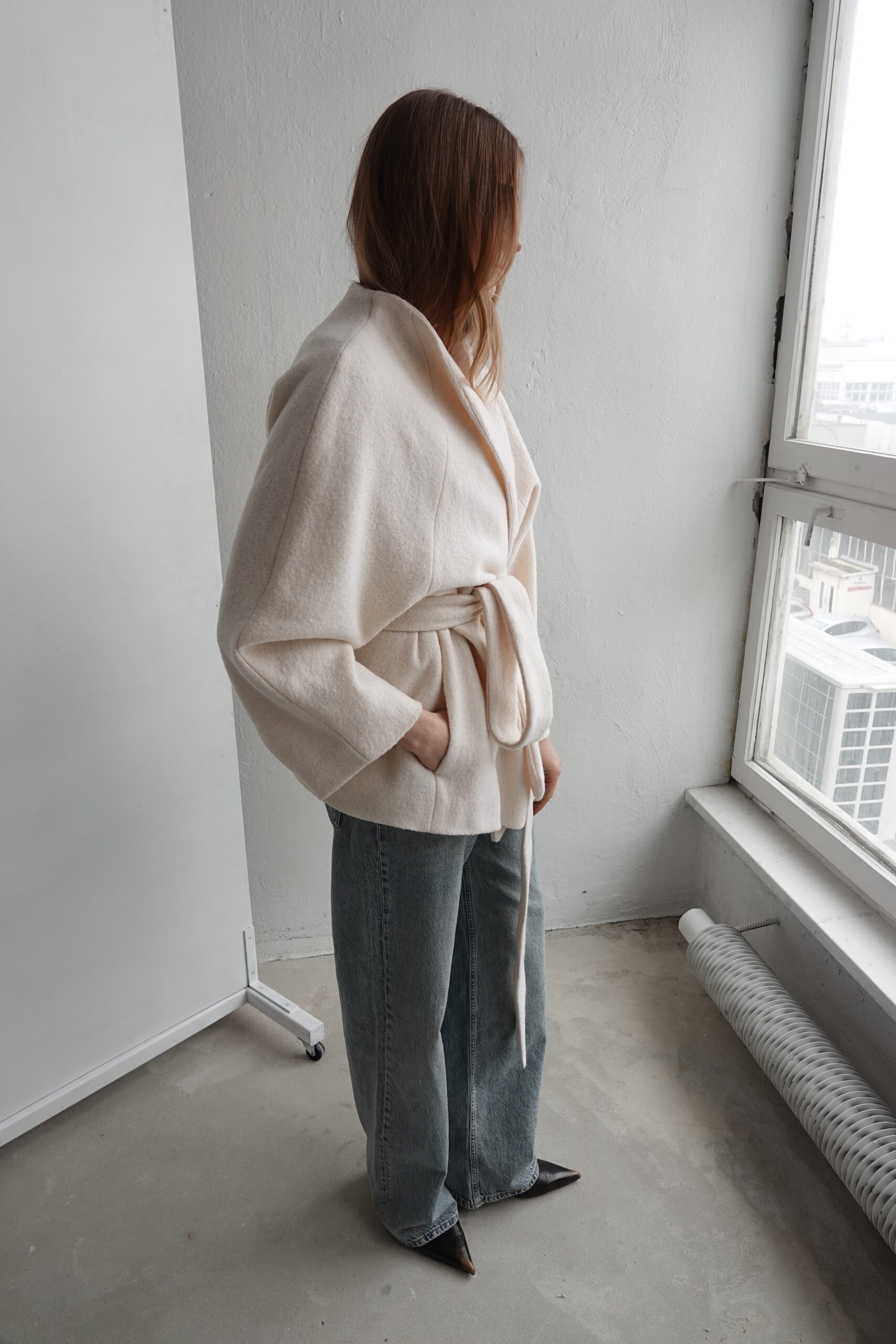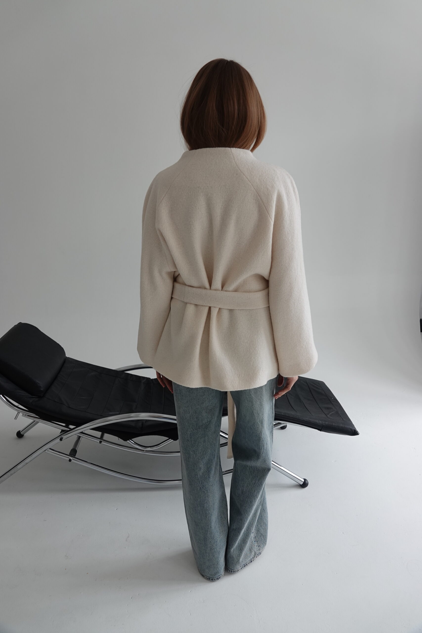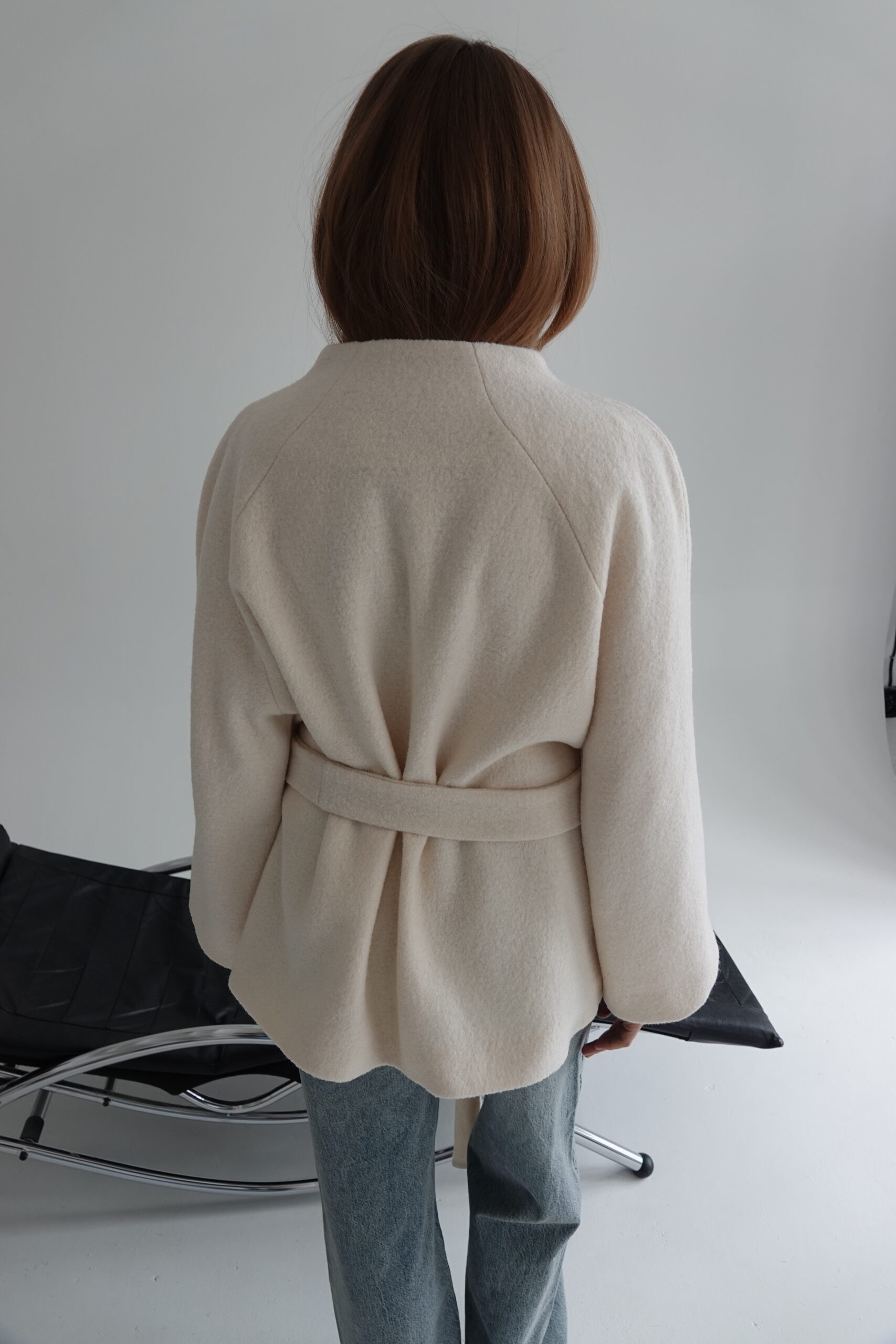Ava to kurtka zaprojektowana z myślą o czystej, nieprzerwanej linii – bez szlufek, które mogłyby zaburzyć jej minimalistyczną formę. Brak zapięcia podkreśla lekkość konstrukcji, a długi pasek pozwala dowolnie modelować sylwetkę – od swobodnej po bardziej dopasowaną. Przeskalowany krój i rękaw reglanowy nadają projektowi nowoczesny charakter.