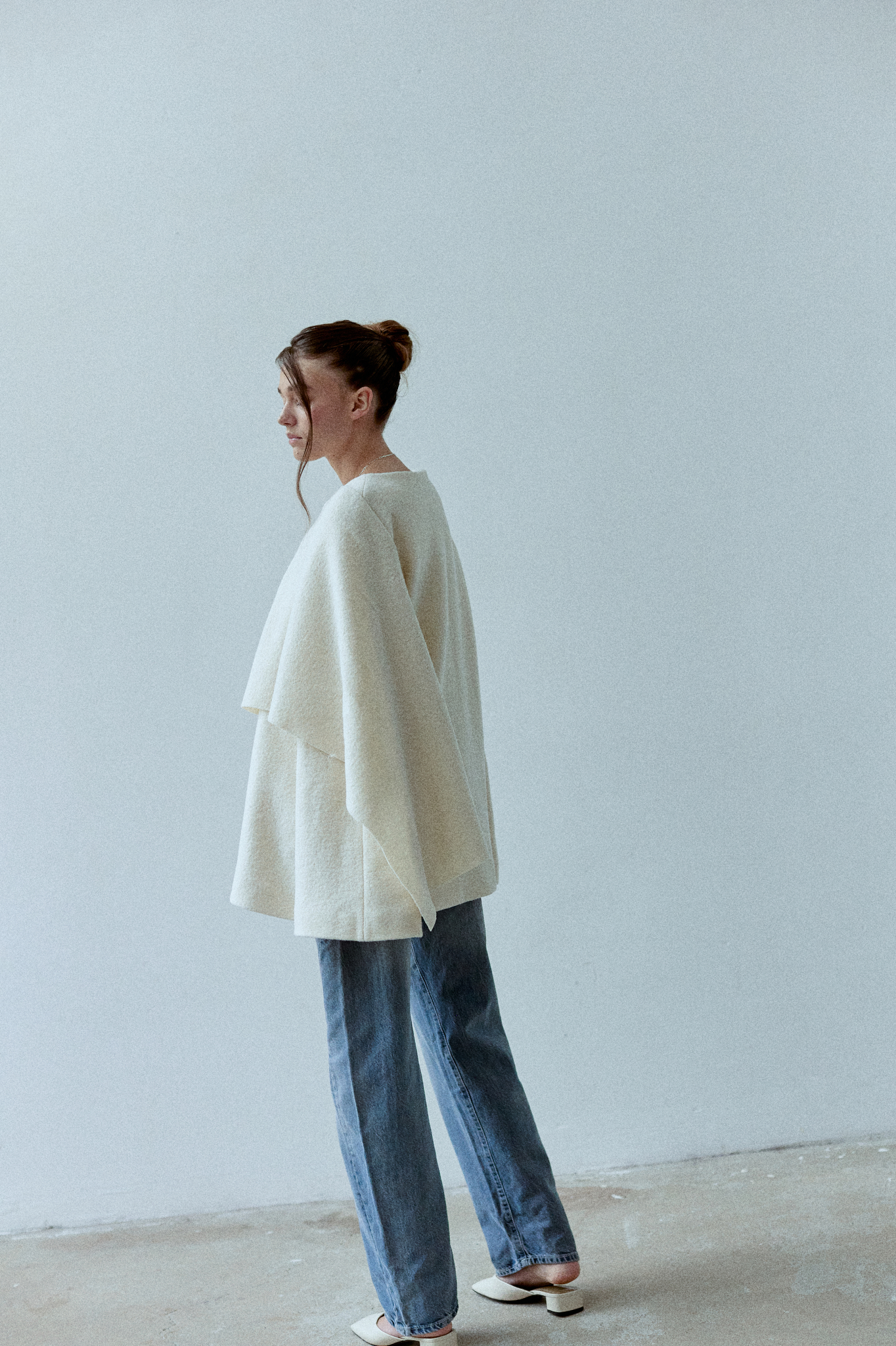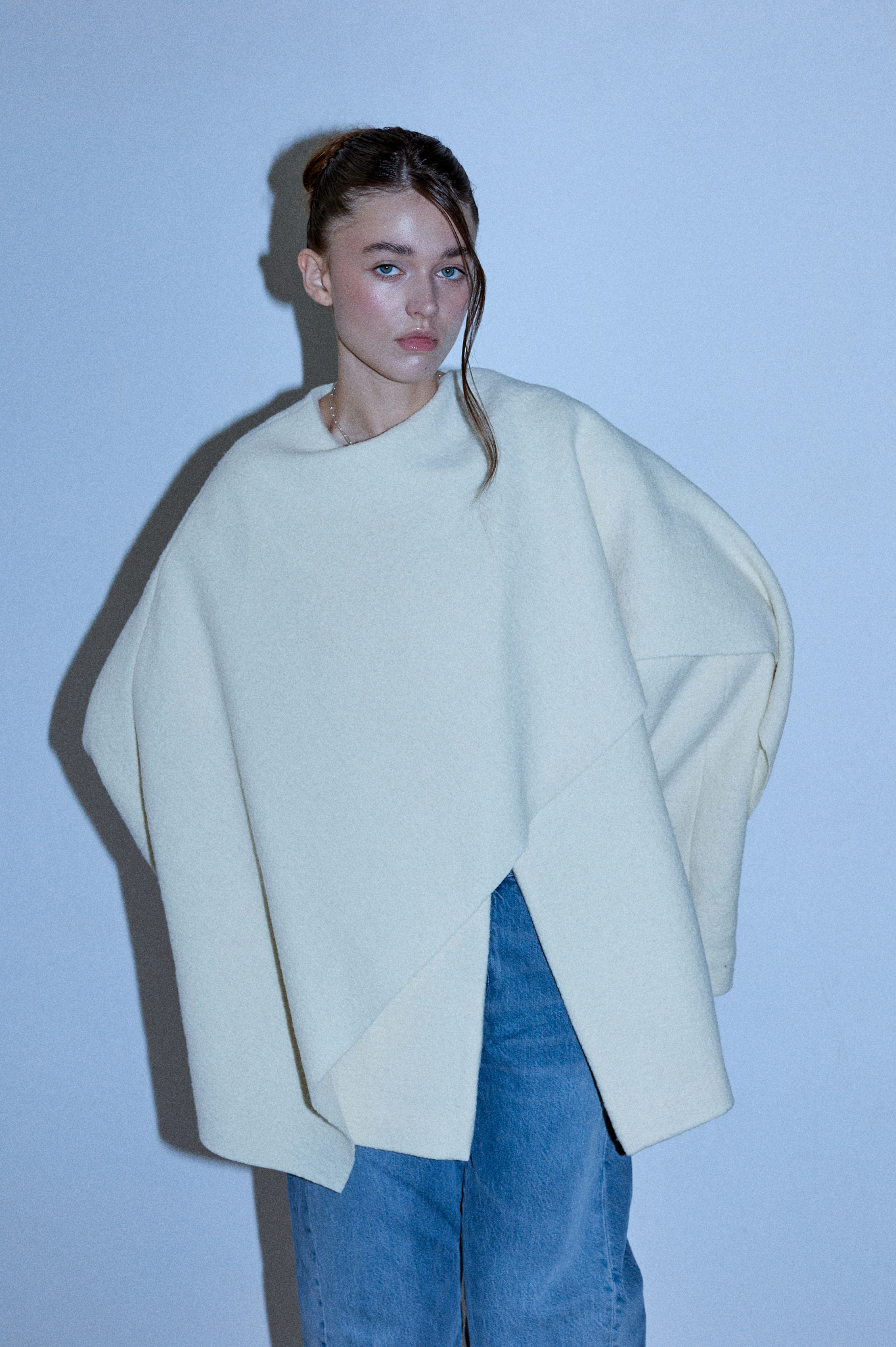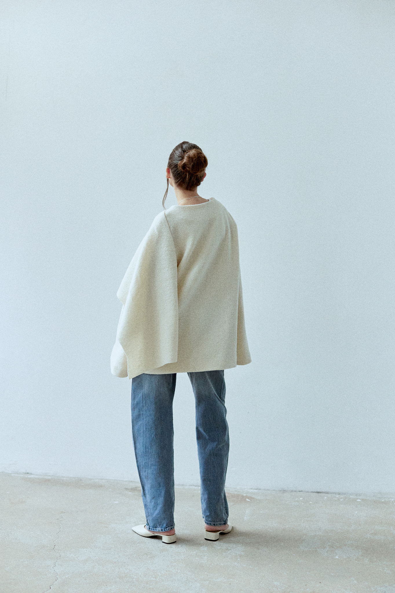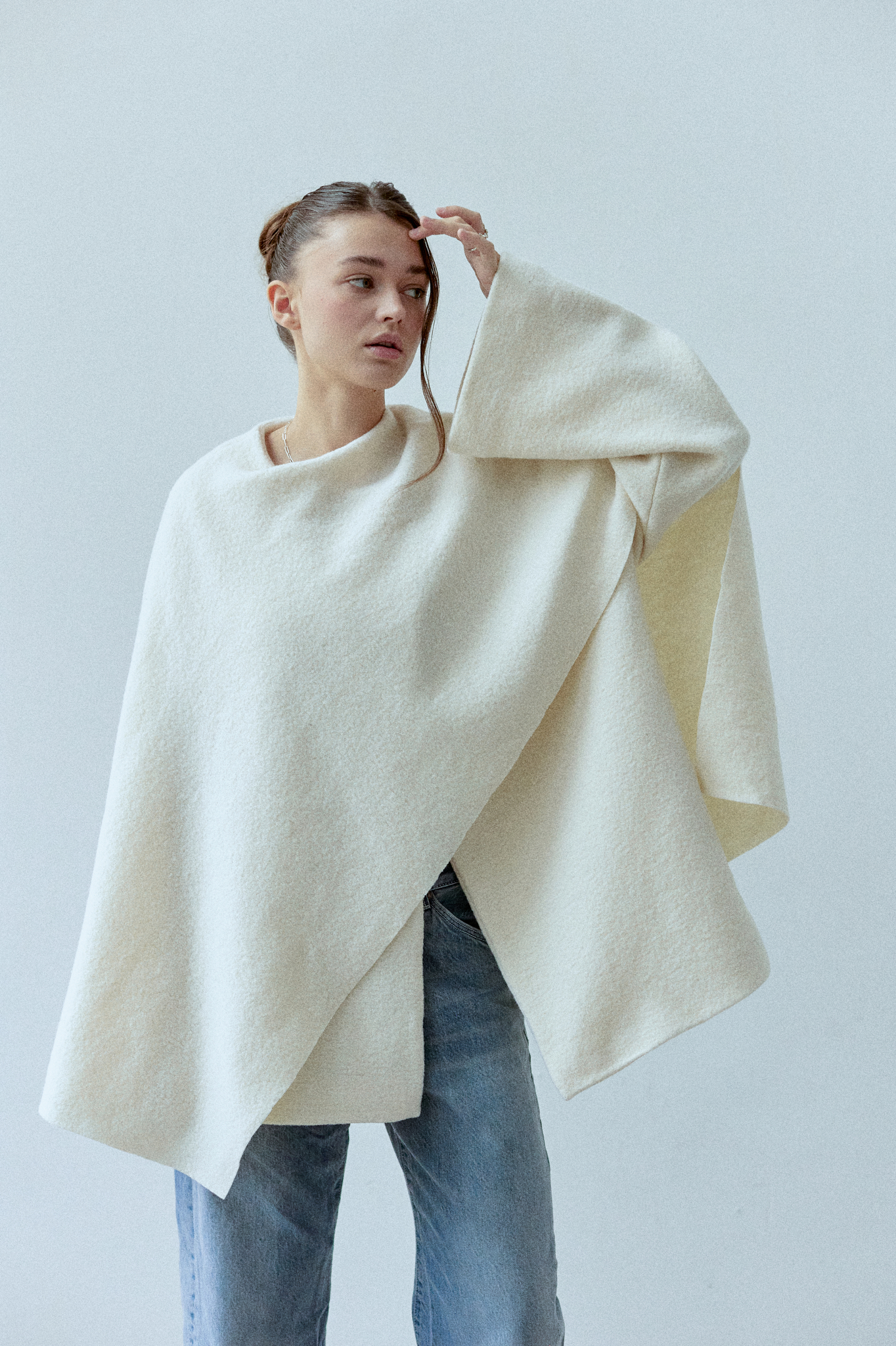 Alba to płaszcz o prostym, ponadczasowym kroju, pozbawiony taliowania dla czystej, nowoczesnej linii, wykonany z wełny parzonej. Ozdobny, wbudowany szal miękko otula sylwetkę, tworząc charakterystyczny detal projektu. Płaszcz zapinany na dwa guziki ukryte pod szalem.
