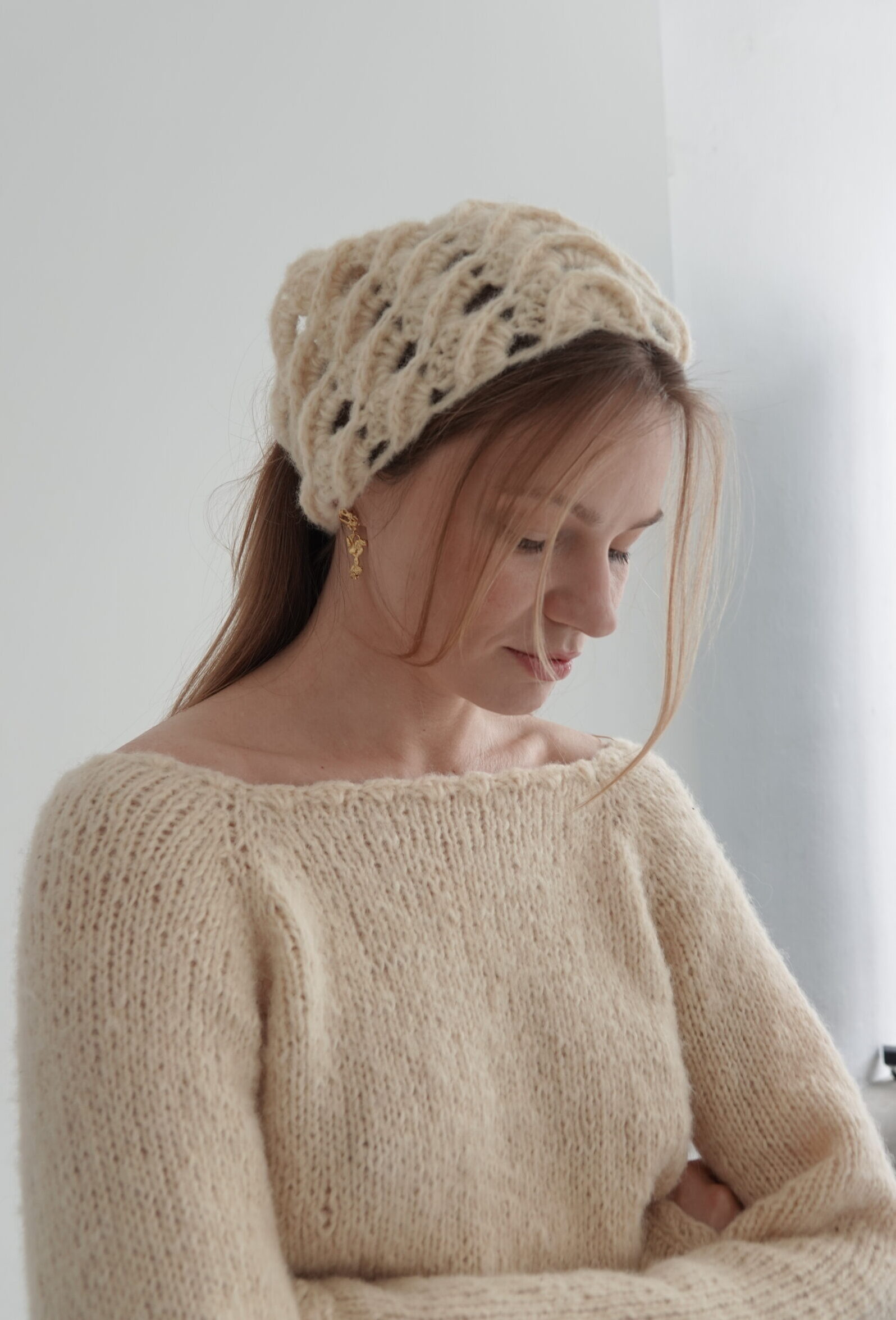 Otwarty splot nadaje jej wyjątkową lekkość, a naturalny odcień ecru doskonale komponuje się zarówno z jasną, jak i kontrastową garderobą. Przepaska może być noszona klasycznie na włosach lub jako subtelny akcent stylizacyjny.