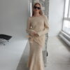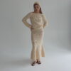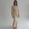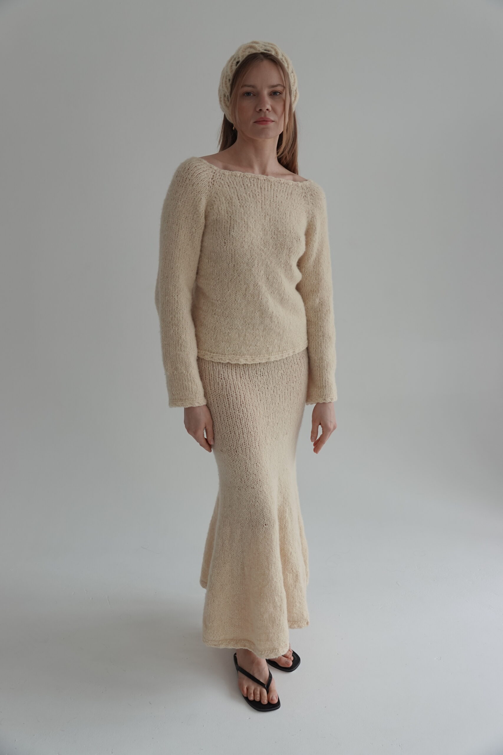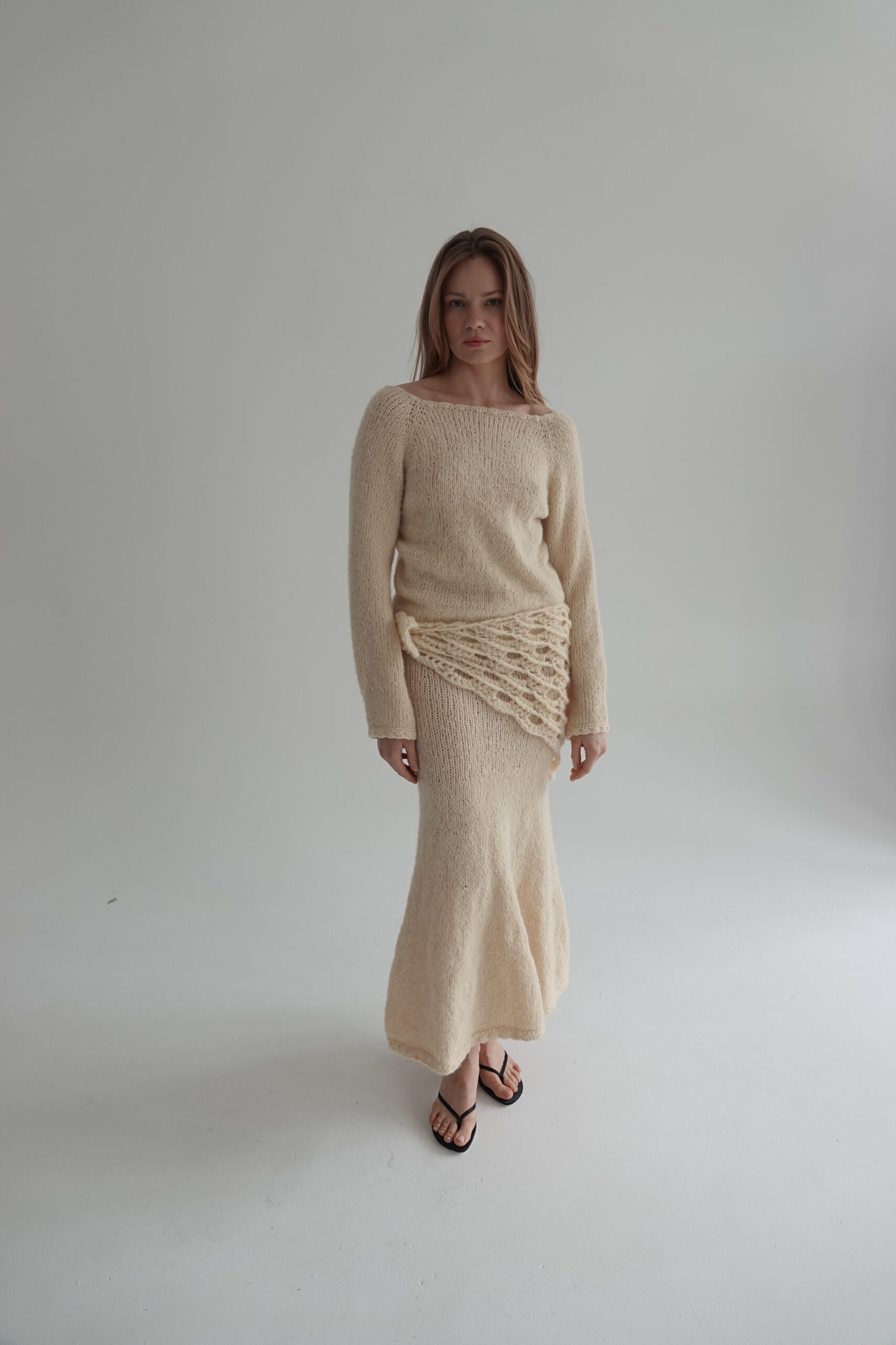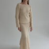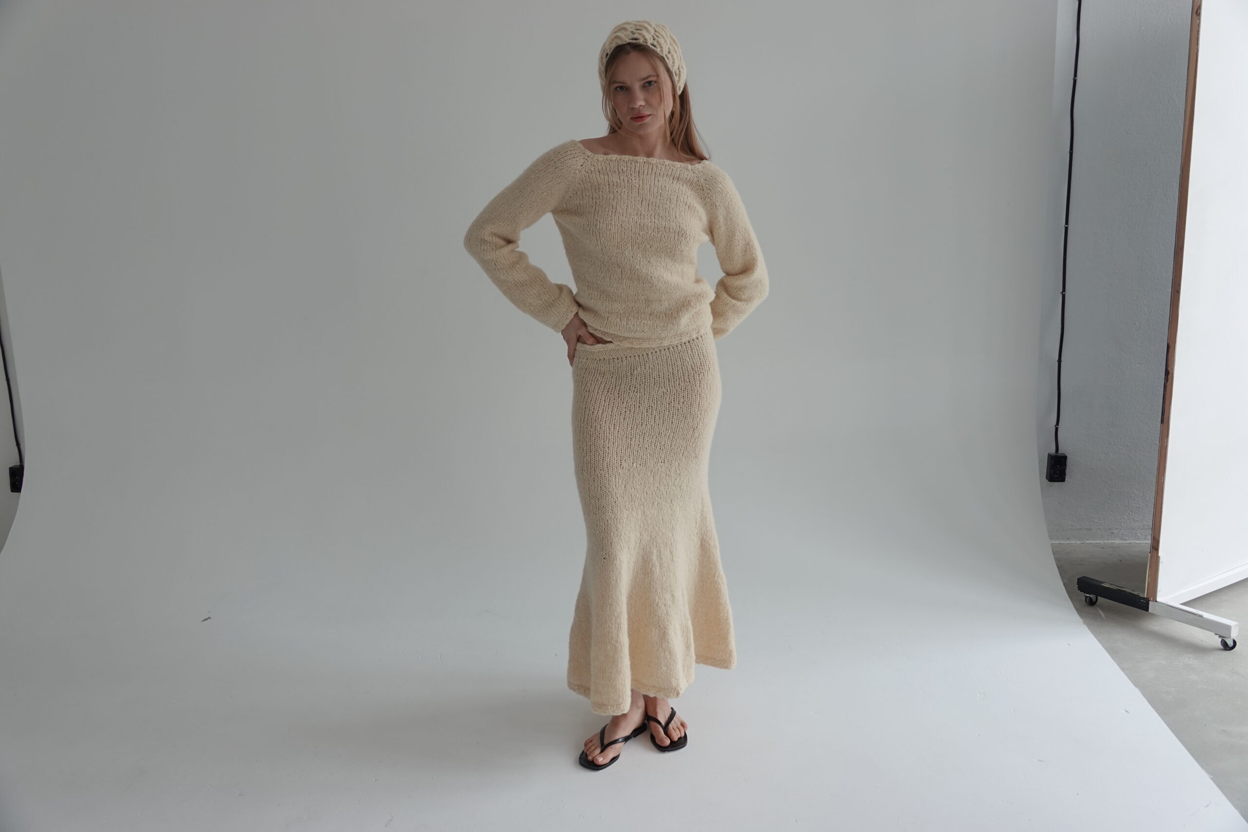 Długa, ręcznie wykonana spódnica z miękkiej dzianiny o subtelnej fakturze, stworzona z myślą o komforcie i ponadczasowej elegancji. Model dopasowany w górnej części, delikatnie rozszerzający się ku dołowi, pięknie podkreśla sylwetkę i porusza się z lekkością przy każdym kroku.