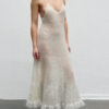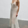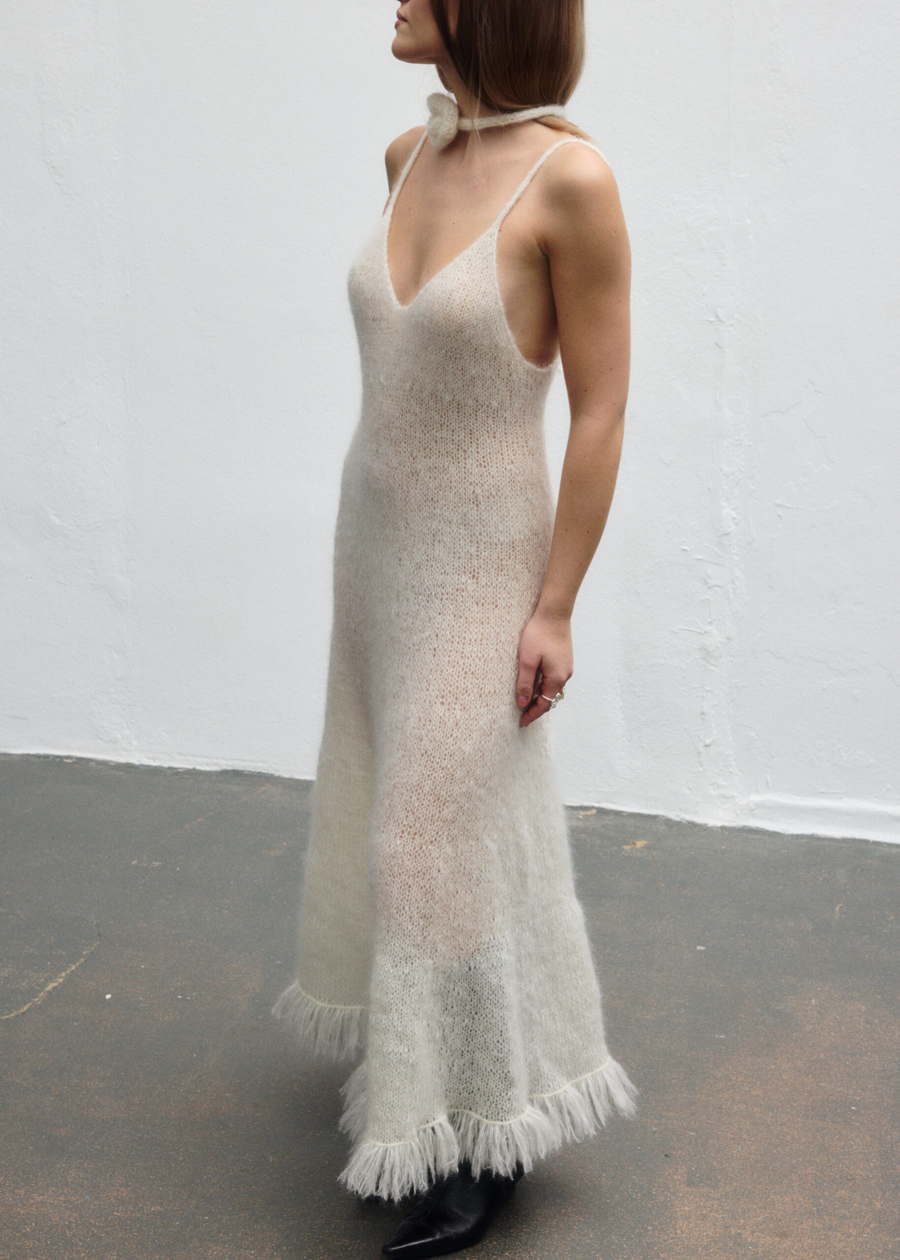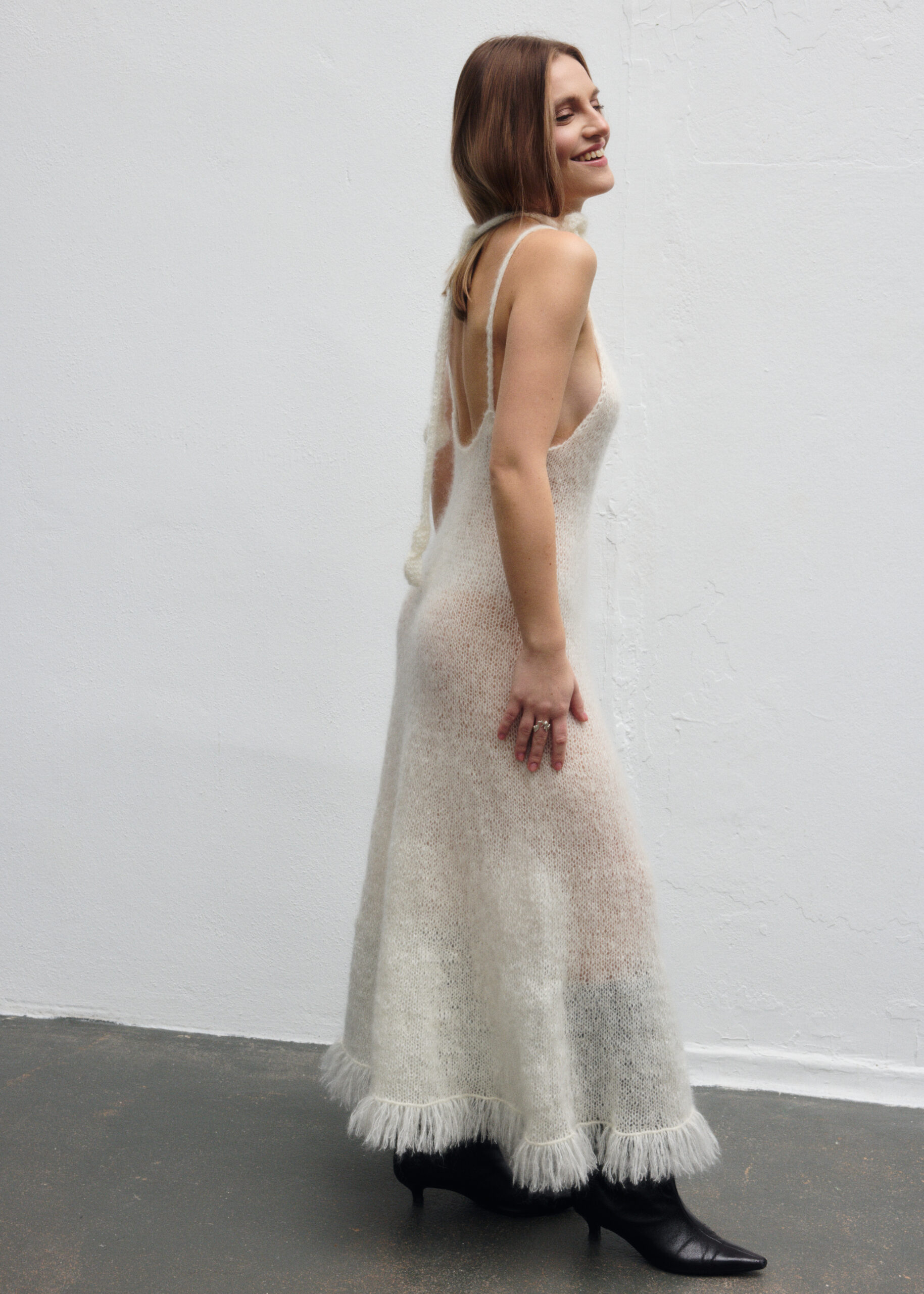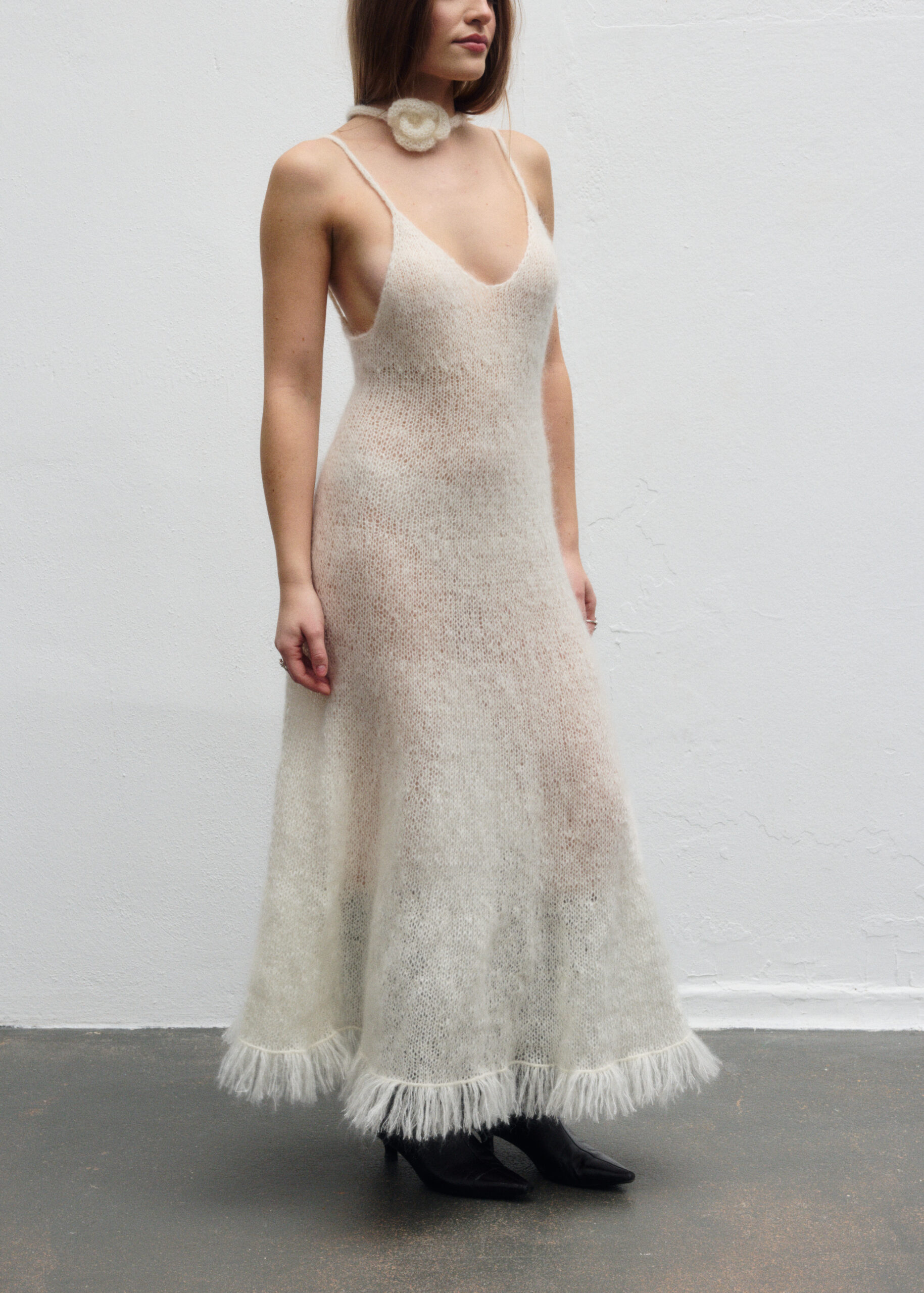 Delikatność i subtelność zamknięte w formie – Ofelia to ręcznie wykonana na drutach sukienka na cienkich ramiączkach, która zmysłowo podkreśla sylwetkę dzięki lekkiemu taliowaniu. Jej charakterystycznym detalem są frędzle przy dolnej krawędzi, nadające projektowi niepowtarzalny, artystyczny wyraz.