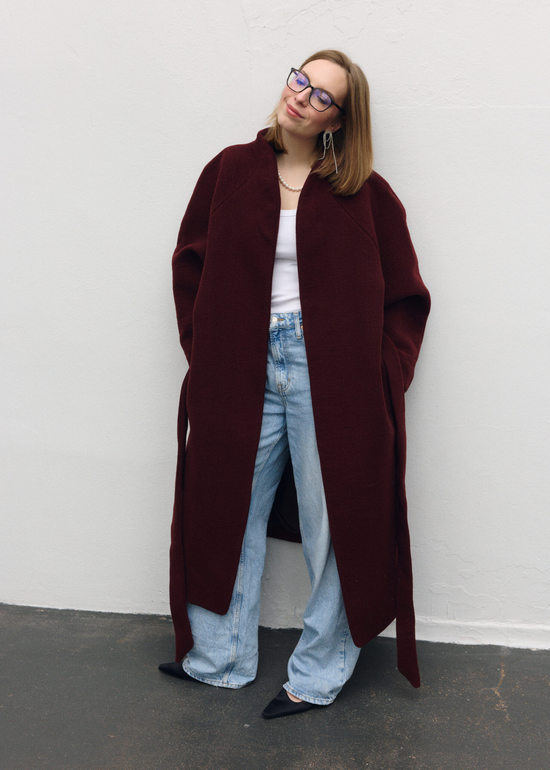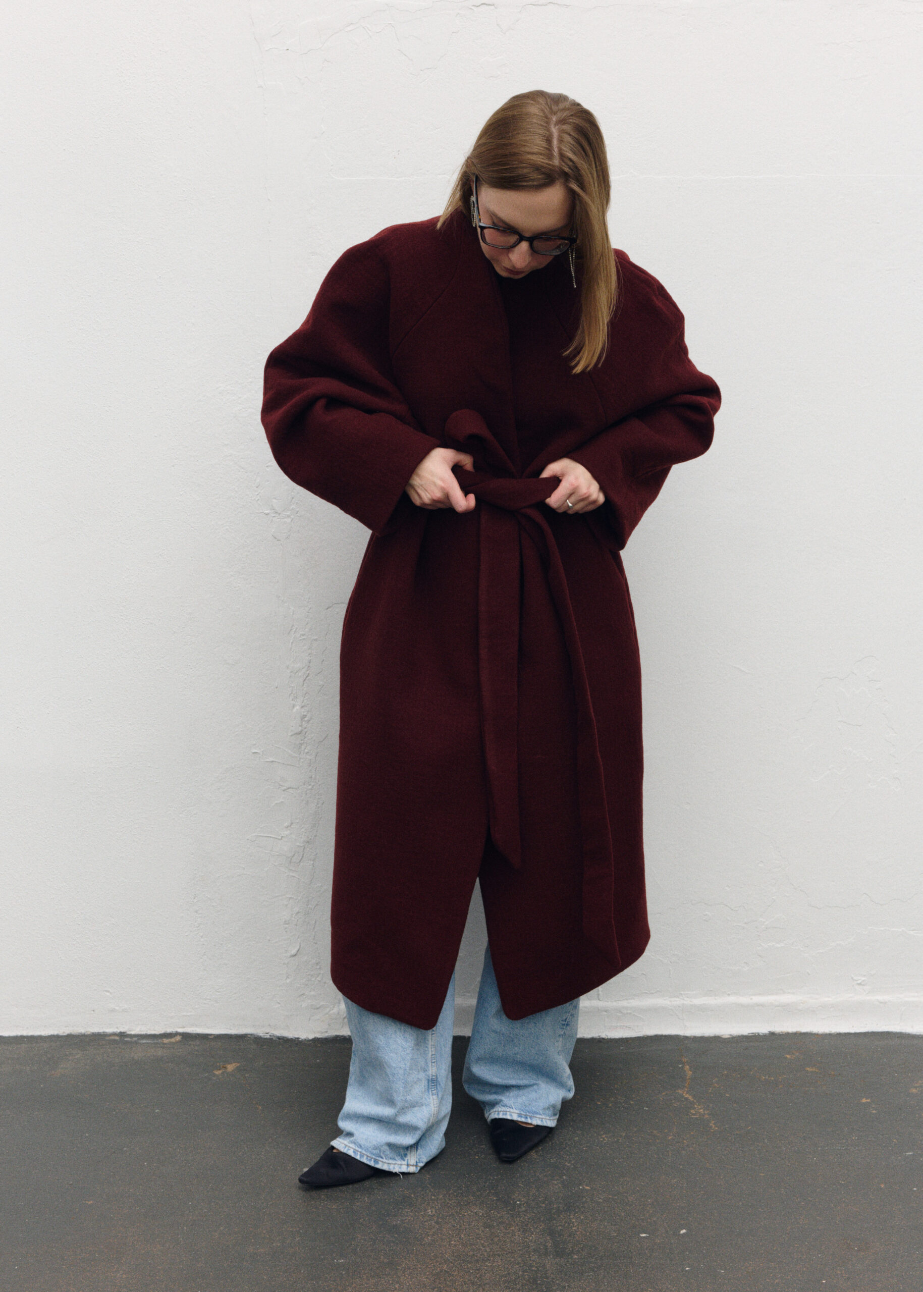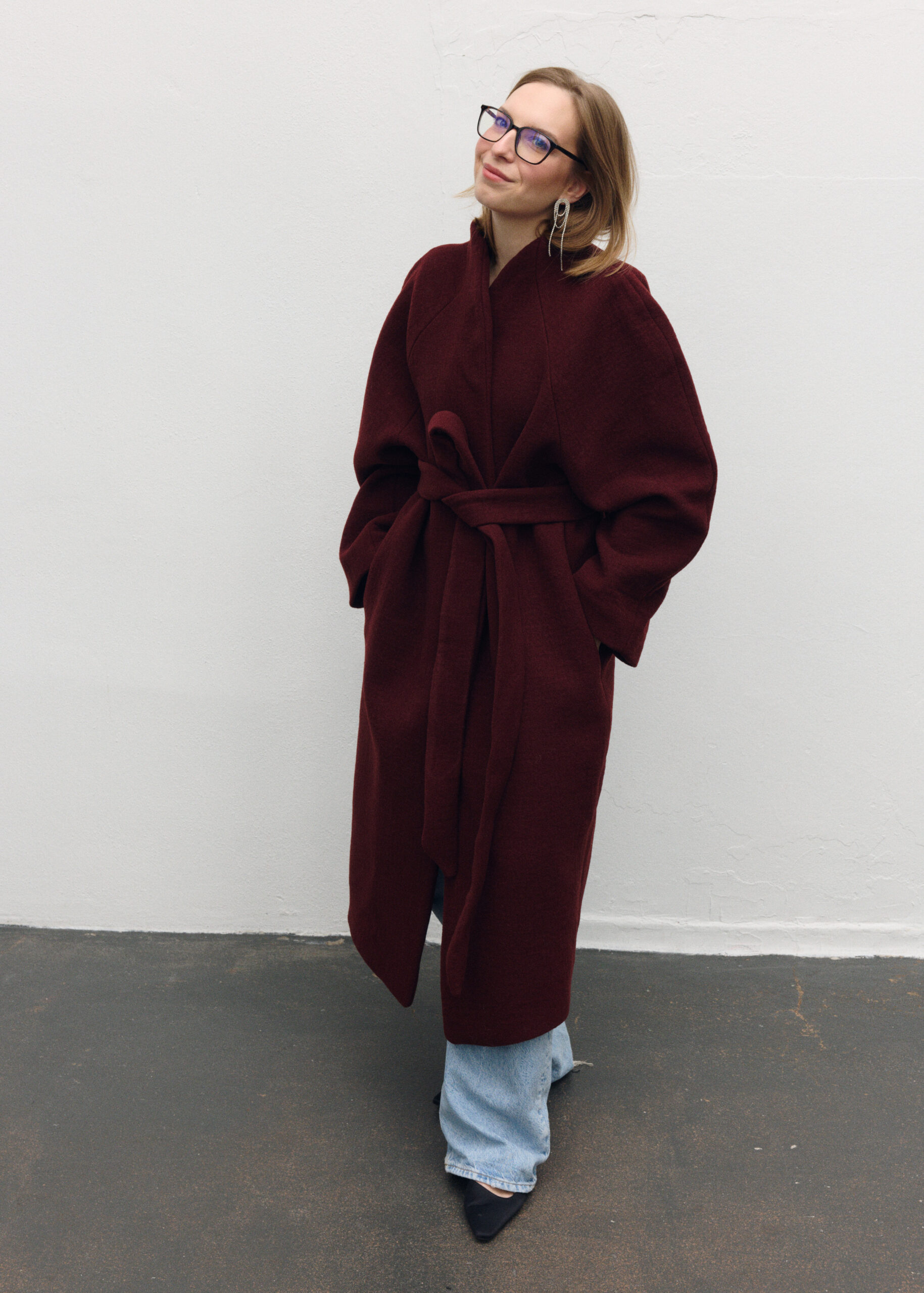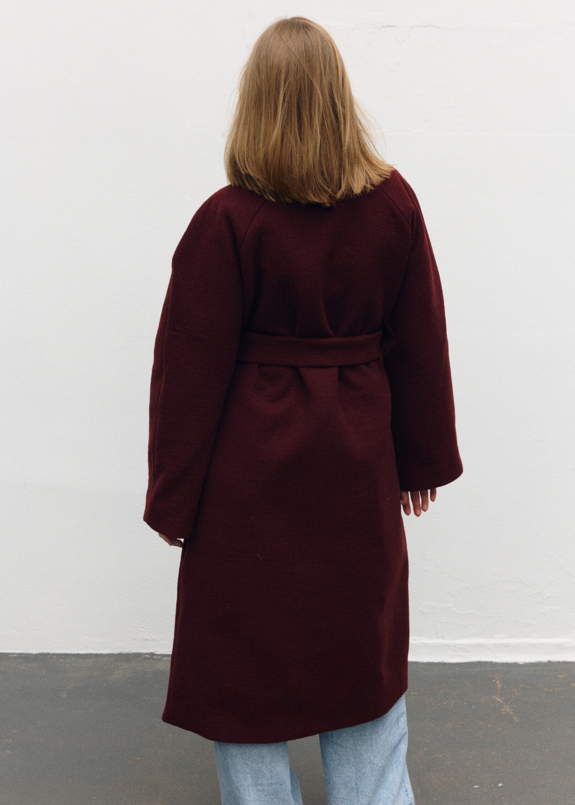 Płaszcz Ava został zaprojektowany z myślą o czystej, nieprzerwanej linii – bez szlufek, które mogłyby zaburzyć jego minimalistyczną formę. Brak zapięcia podkreśla lekkość konstrukcji, a długi pasek pozwala dowolnie modelować sylwetkę – od swobodnej po bardziej dopasowaną. Przeskalowany krój i rękaw reglanowy nadają projektowi nowoczesny charakter.