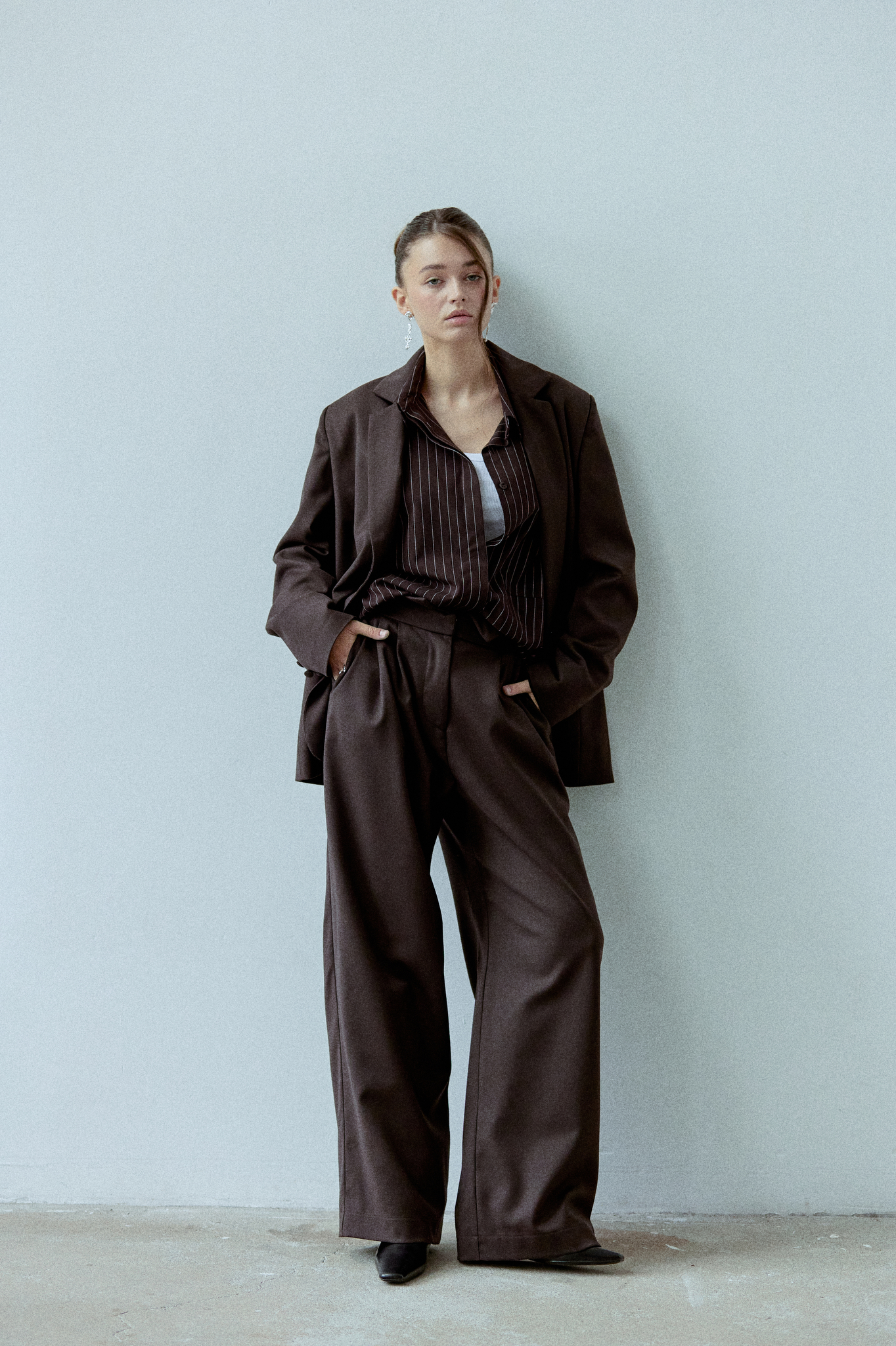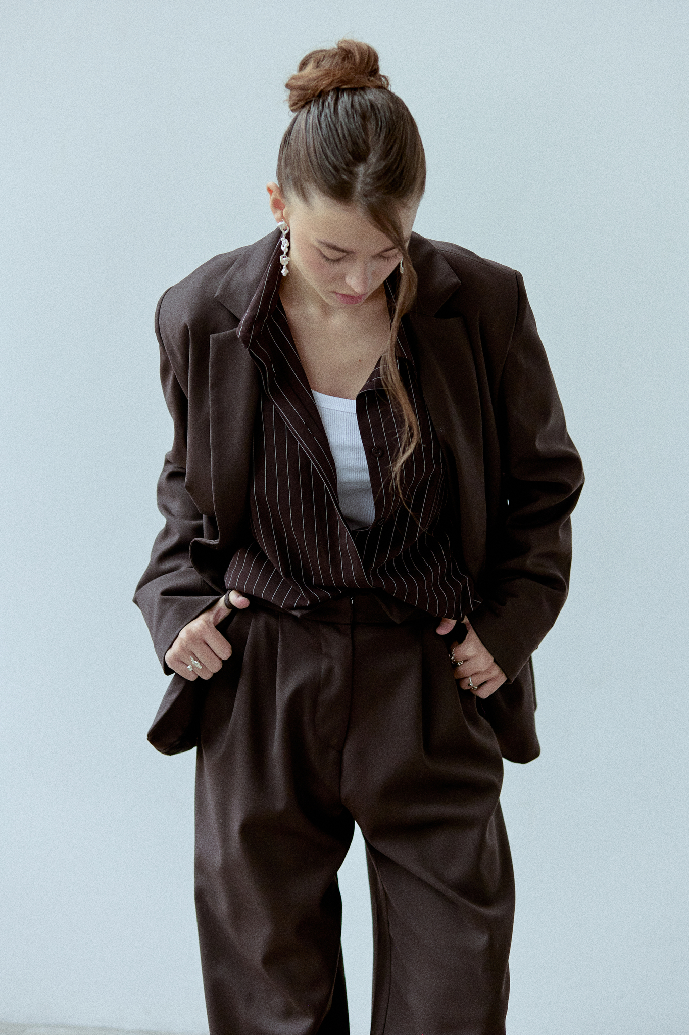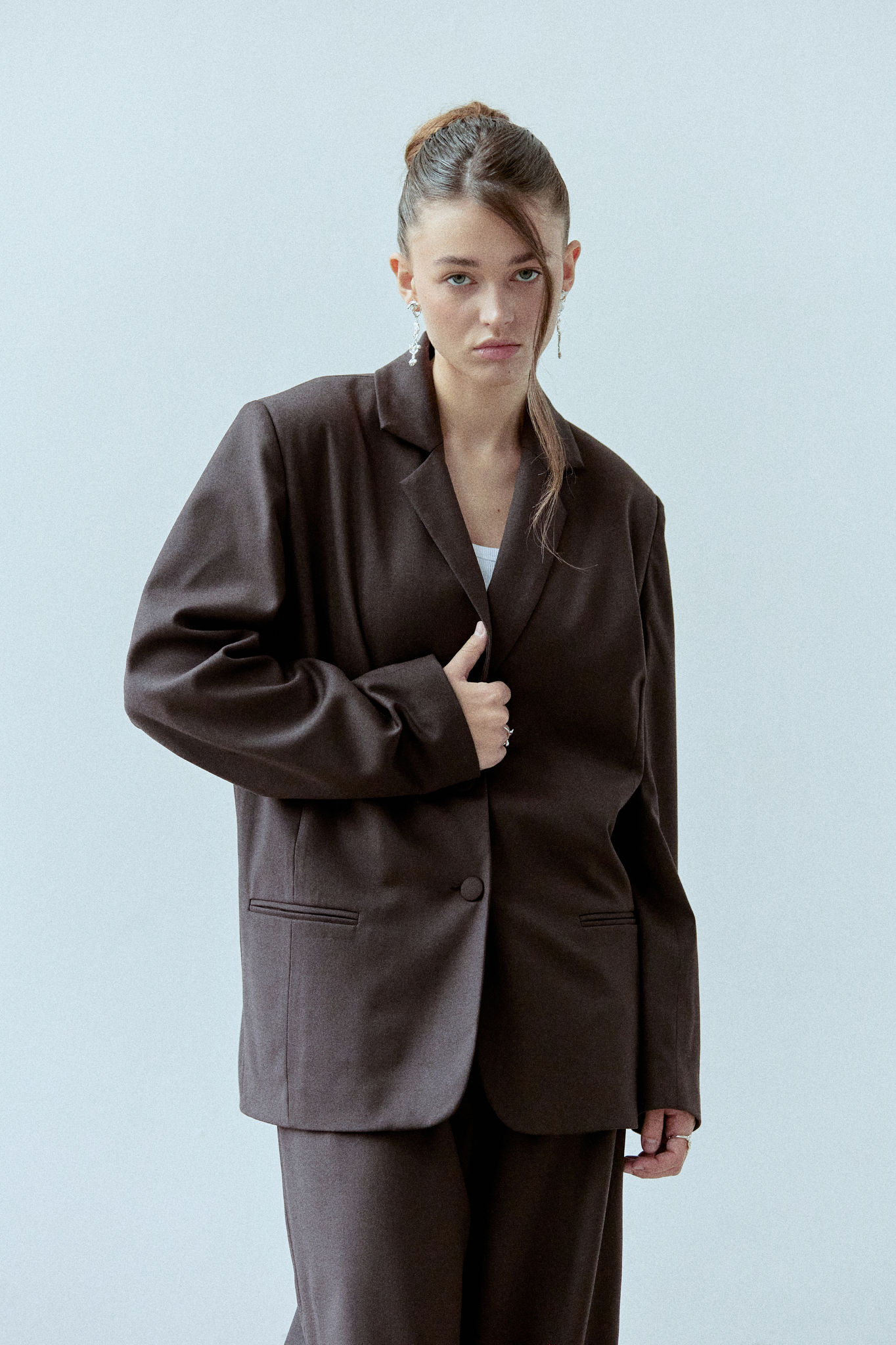 Marynarka Flavia to nowoczesna interpretacja klasycznej, męskiej formy w kobiecym wydaniu. Ma prosty, lekko oversize’owy krój, który nadaje sylwetce swobodny, a zarazem elegancki charakter. Uszyty z wysokiej jakości wełny w głębokim odcieniu brązu, wyróżnia się dopracowanymi detalami – powlekanymi guzikami, kieszeniami bocznymi oraz guzikami przy mankietach. Subtelnie zaznaczone ramiona podkreślają jego strukturę, a rozporek z tyłu zapewnia lekkość i komfort noszenia. Dla pełnego efektu stylizacji połącz go ze spodniami Flavia i koszulą Blanca.